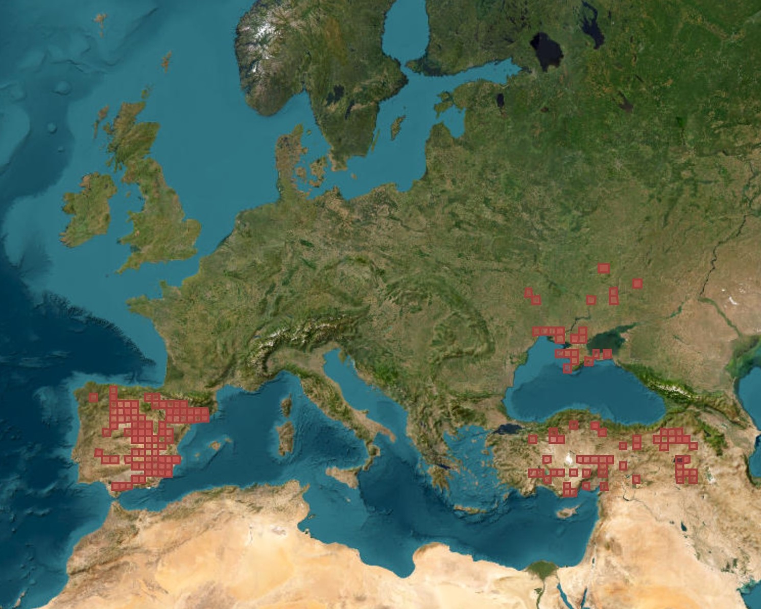 A la península Ibèrica es concentra sobretot a la depressió de l’Ebre, a les submesetes nord i sud, i en indrets del Sistema Subbètic, des del nivell del mar fins als 1000 m, amb cites excepcionals que arriben als 1500 m (ex. Bronchales; Terol).
